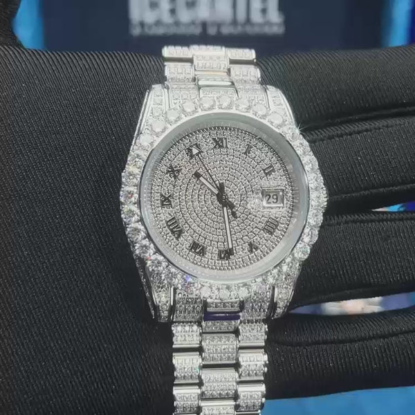 Moissanite Presidential Watch | 41MM | Roman Numeral Dial | 18.3CT Iced Out | 14K White Gold